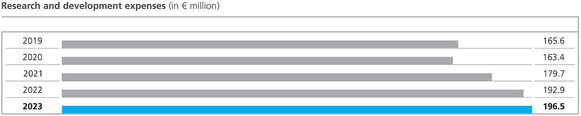 The basis for our innovative strength is an open and dynamic corporate culture that gives the 1,265 employees in our worldwide research and development centers freedom for creative and entrepreneurial action. The equipment in our development centers enables our employees to turn their ideas into market ready solutions. Our research and development expenses increased by € 3.6 million to € 196.5 million compared to the previous year (€ 192.9 million). The increase in the proportion of sales accounted for by research and development expenses to 7.2 % (previous year: 6.4 %) is mainly due to the demand driven decline in sales. In general, our expenditures are related to the achievement of important milestones, the implementation of individual customer requirements in future innovative products, and the long-term orientation of our innovation activities.