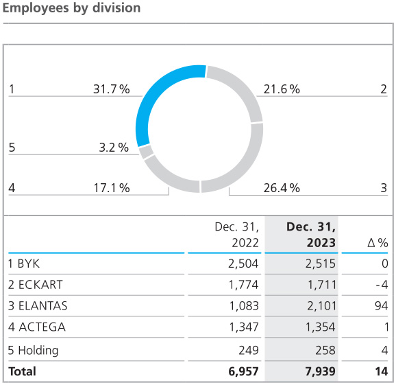 At the end of 2023, the companies of the ALTANA Group employed 7,939 people worldwide (previous year: 6,957). The increase of 982 employees, or 14 %, compared to the previous year was almost exclusively due to the acquisition of the Von Roll Group in September 2023, in which we took over 982 employees.