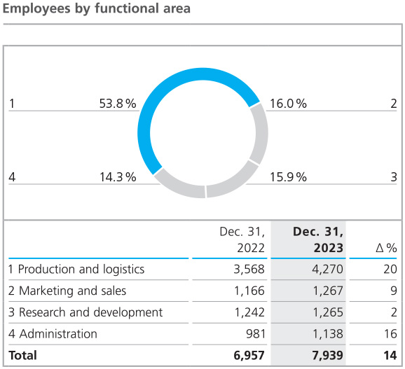 The functional structure of the workforce changed slightly in the 2023 financial year due to the acquisition of the Von Roll Group. With 54 % or 4,270 people (previous year: 3,568), the proportion of employees in production increased, including 725 people due to the acquisition of the Von Roll Group. The number of people employed in research and development rose by 23 to 1,265 employees in 2023 (previous year: 1,242), 47 of whom came from the acquisition of the Von Roll Group. In marketing and sales, the headcount rose by a total of 101 to 1,267 in 2023 (previous year: 1,166). Here, 105 employees were taken over from the Von Roll Group. Administration comprised 1,138 employees in the reporting year (previous year: 981); the increase of 157 people is also mainly due to the acquisition of the Von Roll Group (105 people).
